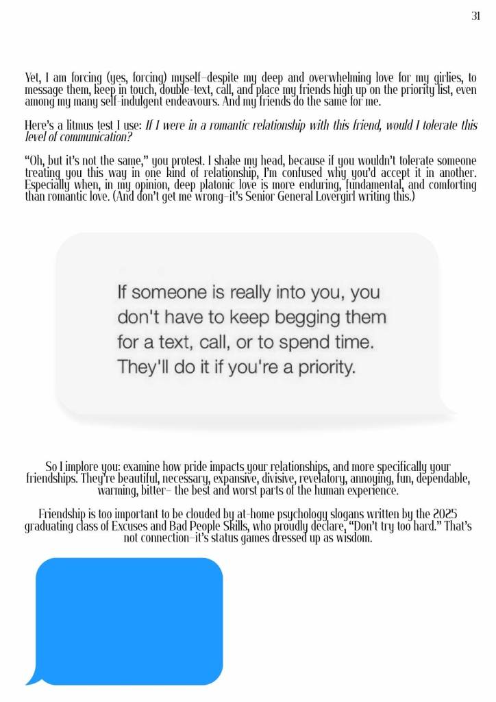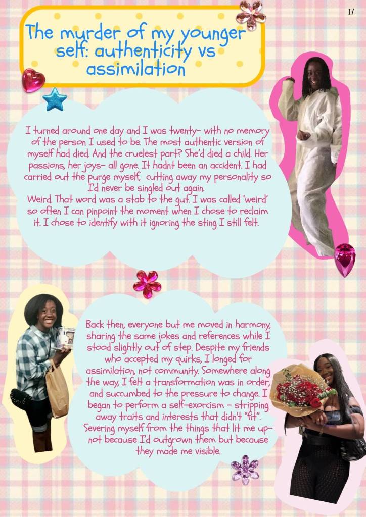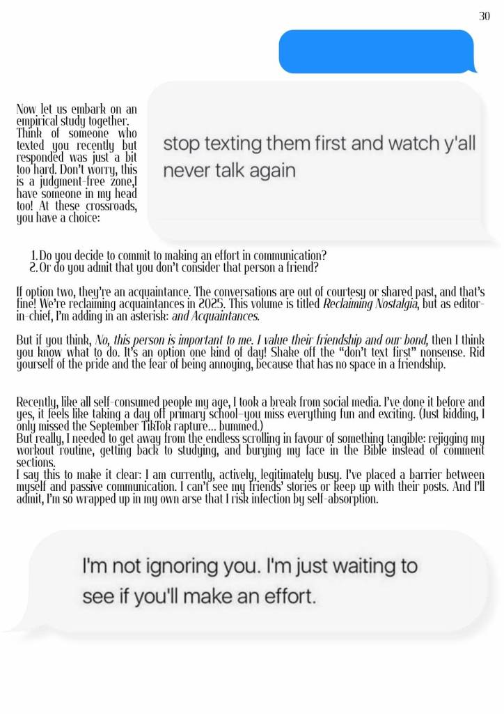 I’ve spent a lot of time (almost this entire year) looking back, readdressing, reobserving, rethinking, reforming and desperately avoiding regressing. It’s been nostalgic and painful and I think this issue sums that all up. I hope you enjoy reading it as much as I had creating it. Until the next one,